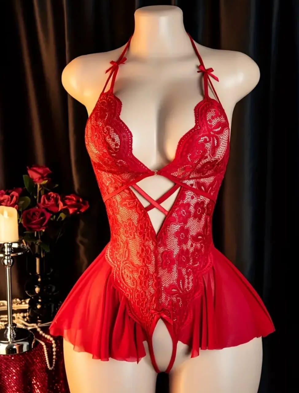 Bodysuit rojo con encaje floral y tirantes ajustables. Este diseño seductor incluye una falda fluida en la parte inferior y detalles cruzados en el pecho, ofreciendo un estilo atrevido y romántico.