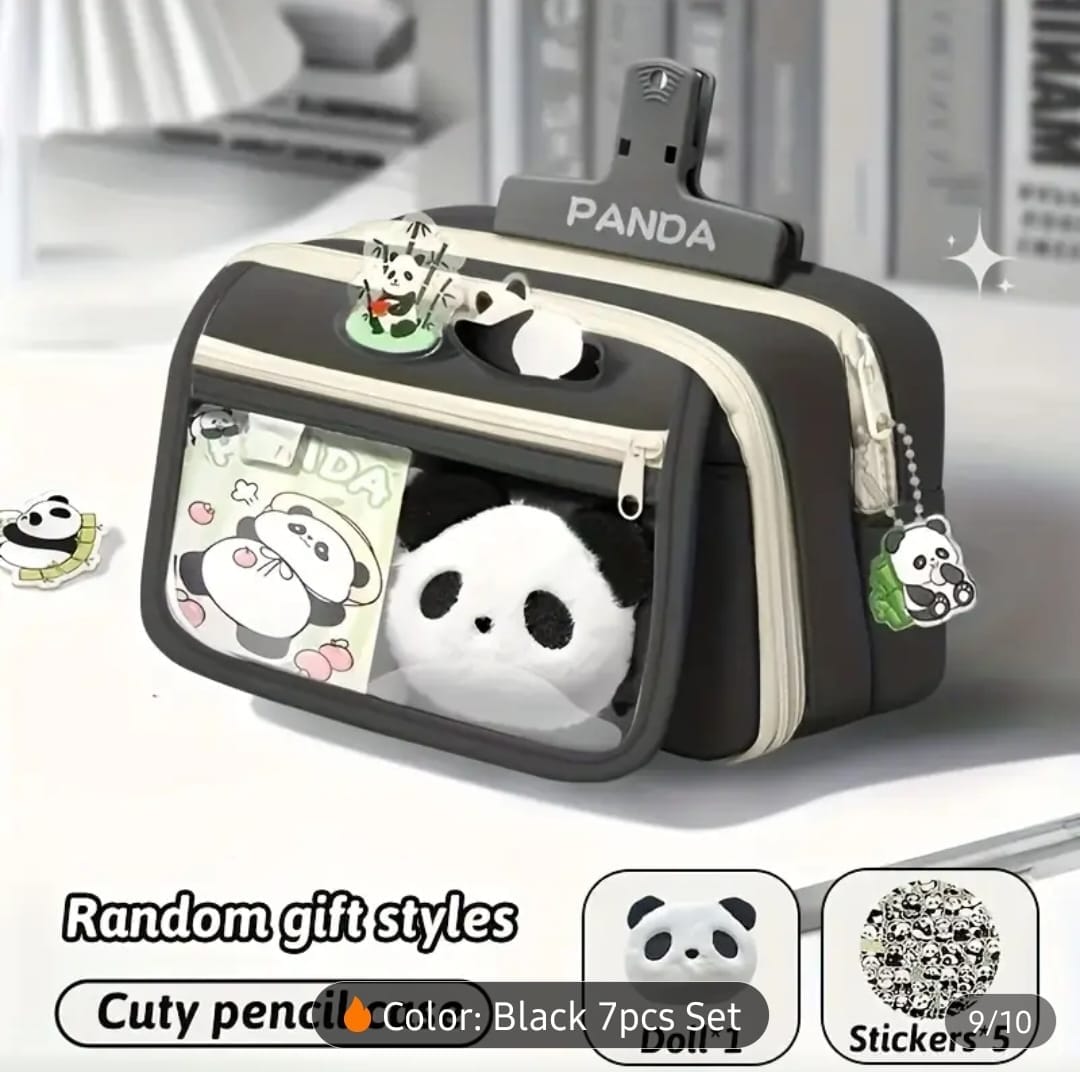Esta cartuchera en color negro tiene un diseño lindo con detalles de panda. Cuenta con múltiples bolsillos y accesorios extra, como llaveros y stickers, para un toque único y divertido.