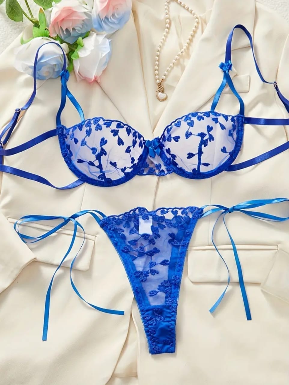 Conjunto de lencería azul con detalles florales.
