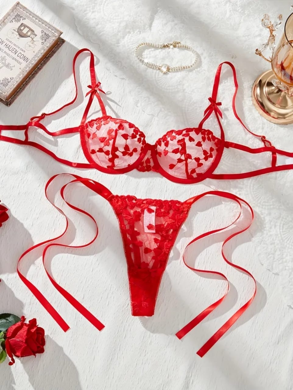 Conjunto de lencería en rojo vibrante, con un sujetador adornado con encaje de corazones y un tanga con cintas. Ideal para ocasiones especiales donde se quiera resaltar la sensualidad y el estilo.