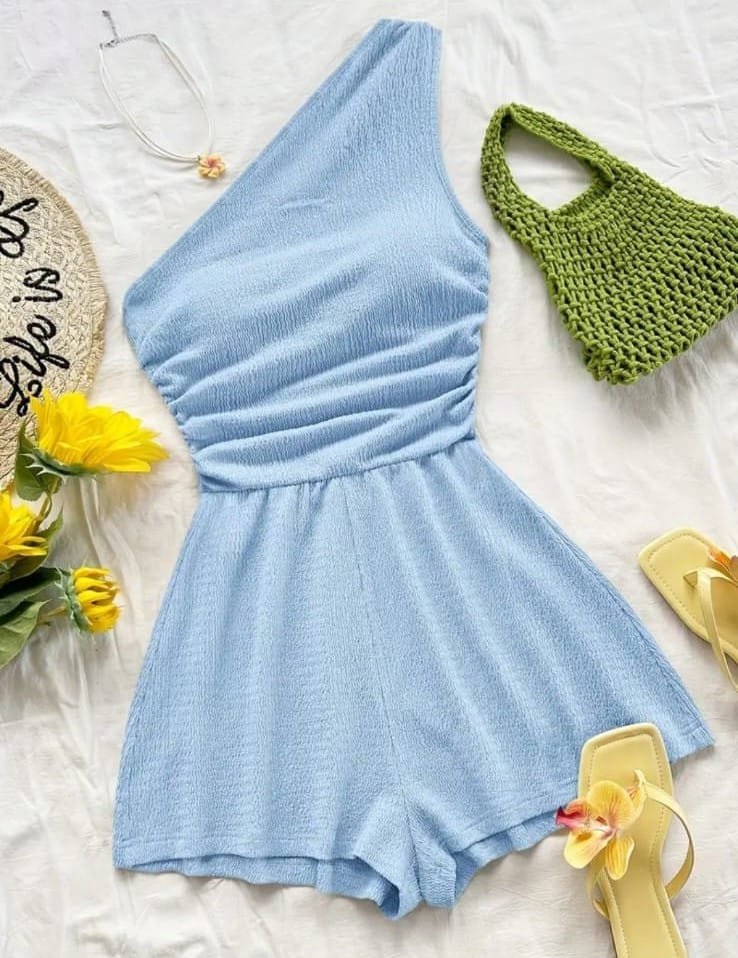 Enterizo corto en tono celeste con diseño de un solo hombro y textura suave, ideal para un outfit fresco y moderno. El drapeado y el ajuste en la cintura ayudan a estilizar la figura sin perder comodidad. Perfecto para días de calor, salidas casuales, playa o vacaciones. Combínalo con sandalias, bolso tejido y accesorios ligeros.