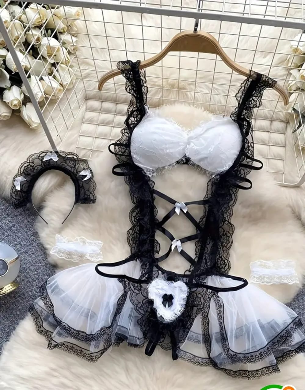 Lencería en blanco y negro con un toque juguetón, con detalles de encaje y tirantes ajustables. Este conjunto de lencería también incluye accesorios como una diadema con orejitas, perfecto para un look divertido y seductor.