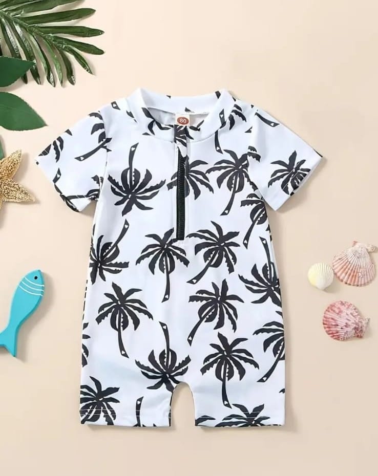 Mono corto para bebé con diseño tropical de palmeras en blanco y negro. Incluye cremallera frontal para vestir y cambiar con facilidad, además de manga corta para mayor frescura en días cálidos. Ideal para playa, piscina o looks veraniegos cómodos.