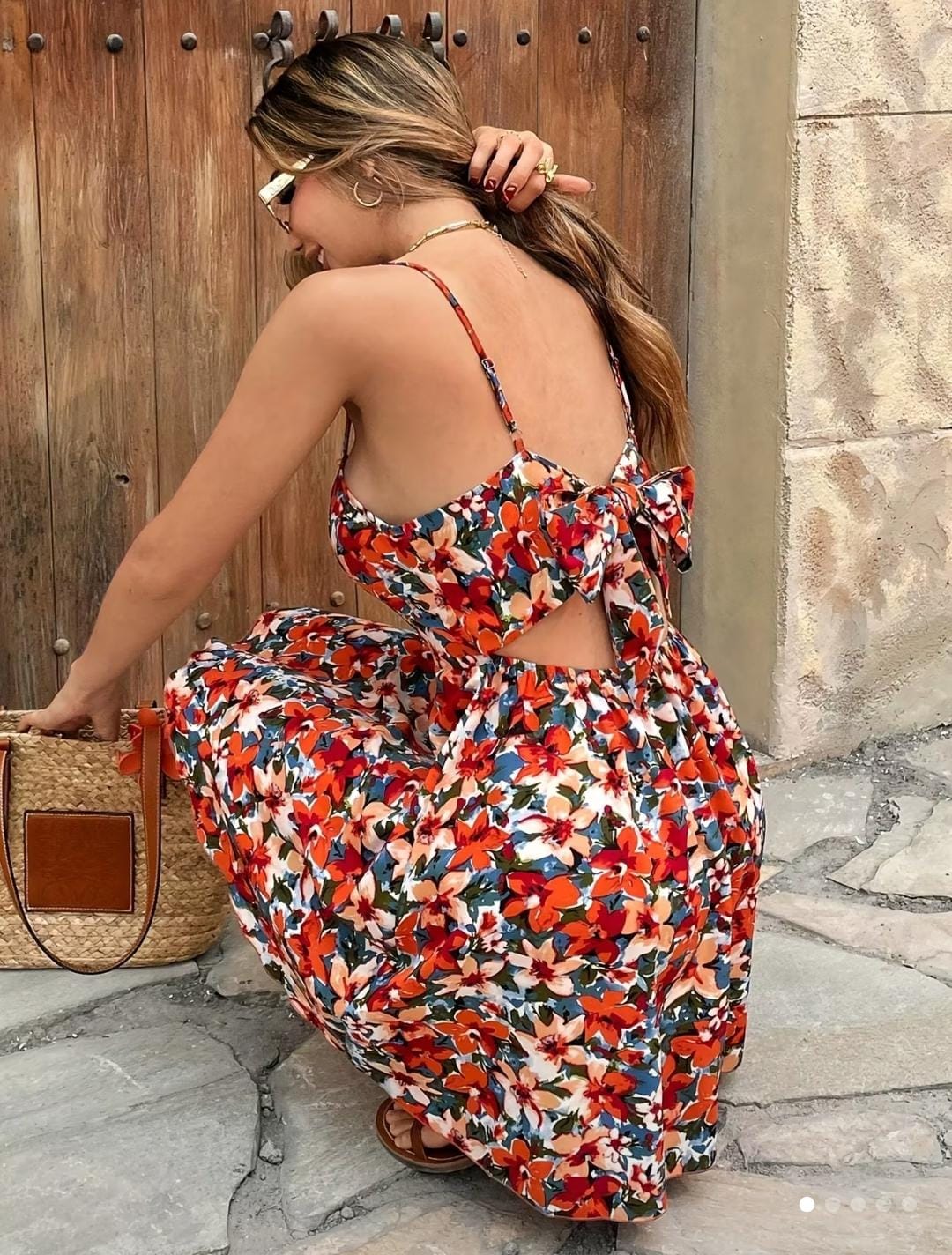 Vestido largo con estampado floral vibrante, tirantes finos y detalle de espalda abierta con moño, ideal para un look femenino y llamativo. Su diseño fresco lo hace perfecto para paseos, vacaciones, fiestas al aire libre o tardes de verano. El estampado aporta color y alegría, mientras el moño da un toque coqueto. Combínalo con sandalias, bolso de rafia y accesorios dorados.